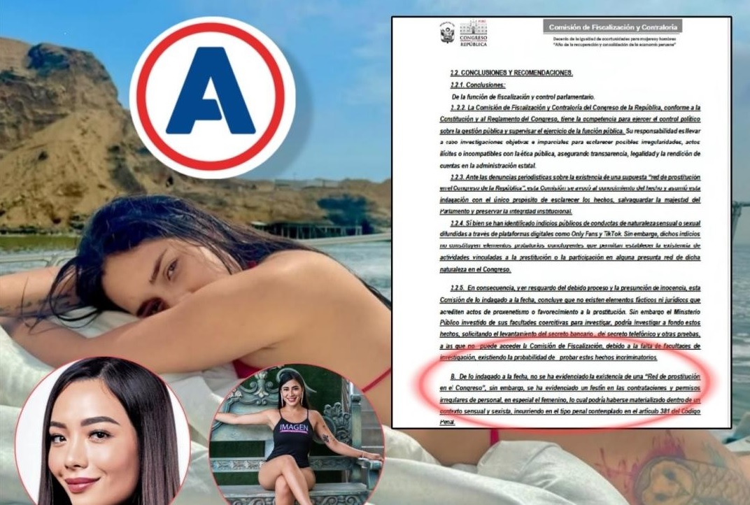 En su parte final, las conclusiones reiteran: “De lo indagado a la fecha, no se ha evidenciado la existencia de una ‘Red de prostitución en el Congreso’, sin embargo, se ha evidenciado un festín en las contrataciones y permisos irregulares de personal, en especial el femenino, lo cual podría haberse materializado dentro de un contexto sensual y sexista, incurriendo en el tipo penal contemplado en el artículo 381 del Código Penal”.