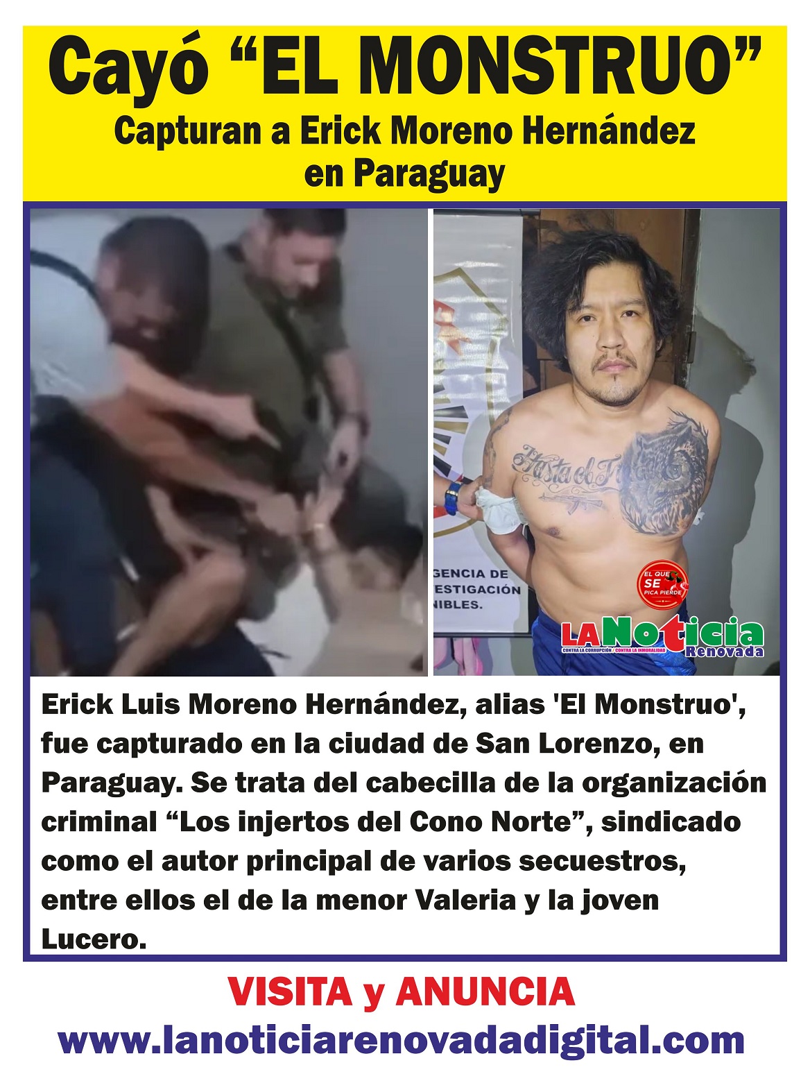 Erick Luis Moreno Hernández, alias ‘El Monstruo’, fue capturado en la ciudad de San Lorenzo, en Paraguay. Se trata del cabecilla de la organización criminal “Los injertos del Cono Norte”, sindicado como el autor principal de varios secuestros, entre ellos el de la menor Valeria y la joven Lucero.