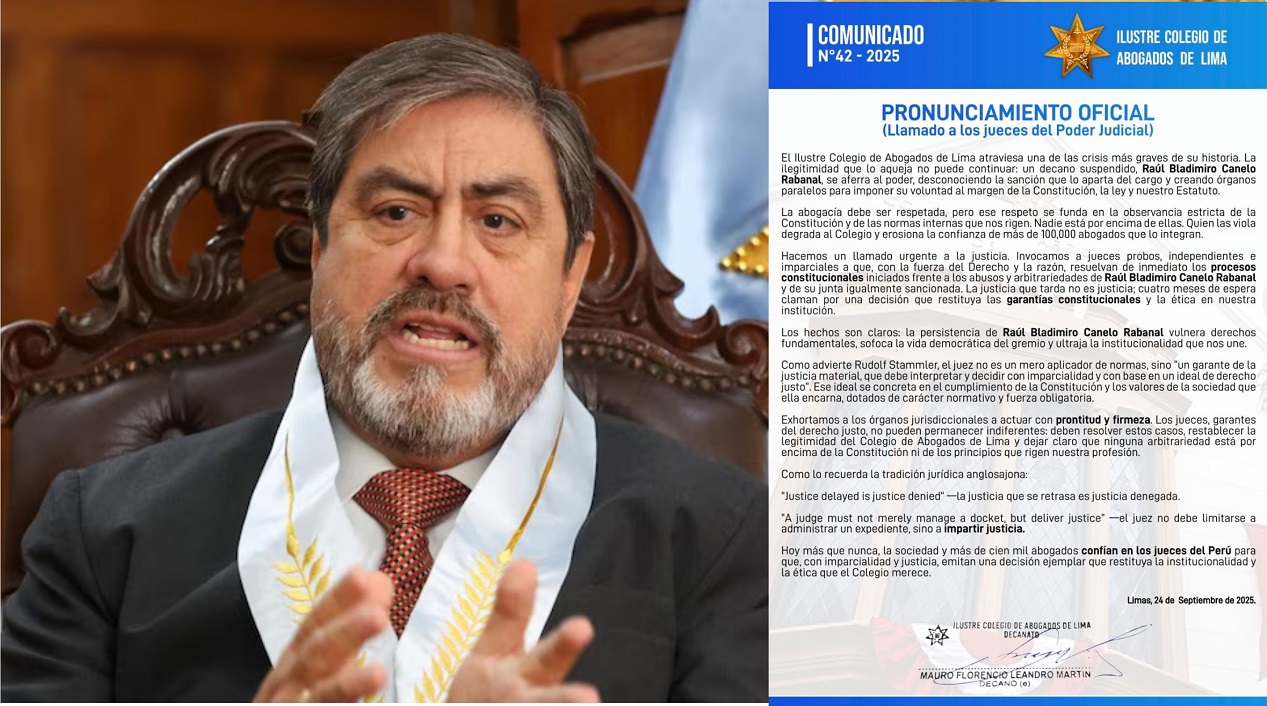 Exhortamos a los órganos jurisdiccionales a actuar con prontitud y firmeza. Los jueces, garantes del derecho justo, no pueden permanecer indiferentes: deben resolver estos casos, restablecer la legitimidad del Colegio de Abogados de Lima y dejar claro que ninguna arbitrariedad está por encima de la Constitución ni de los principios que rigen nuestra profesión.