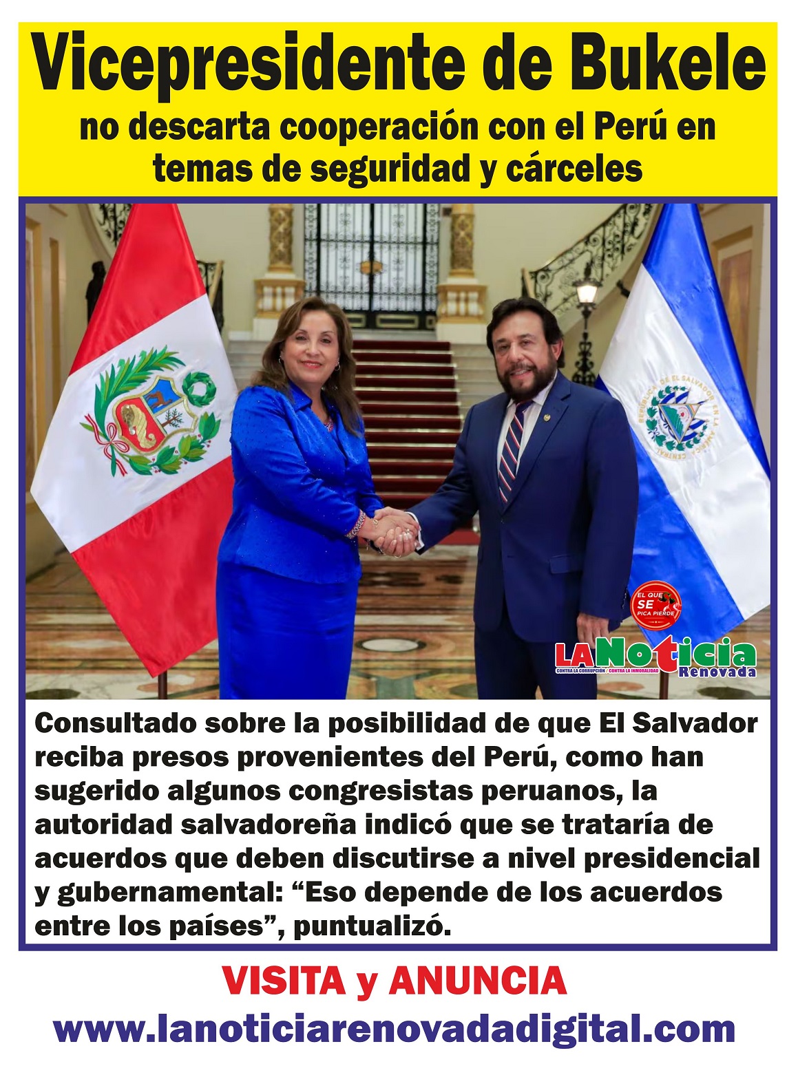 Consultado sobre la posibilidad de que El Salvador reciba presos provenientes del Perú, como han sugerido algunos congresistas peruanos, la autoridad salvadoreña indicó que se trataría de acuerdos que deben discutirse a nivel presidencial y gubernamental: “Eso depende de los acuerdos entre los países”, puntualizó.