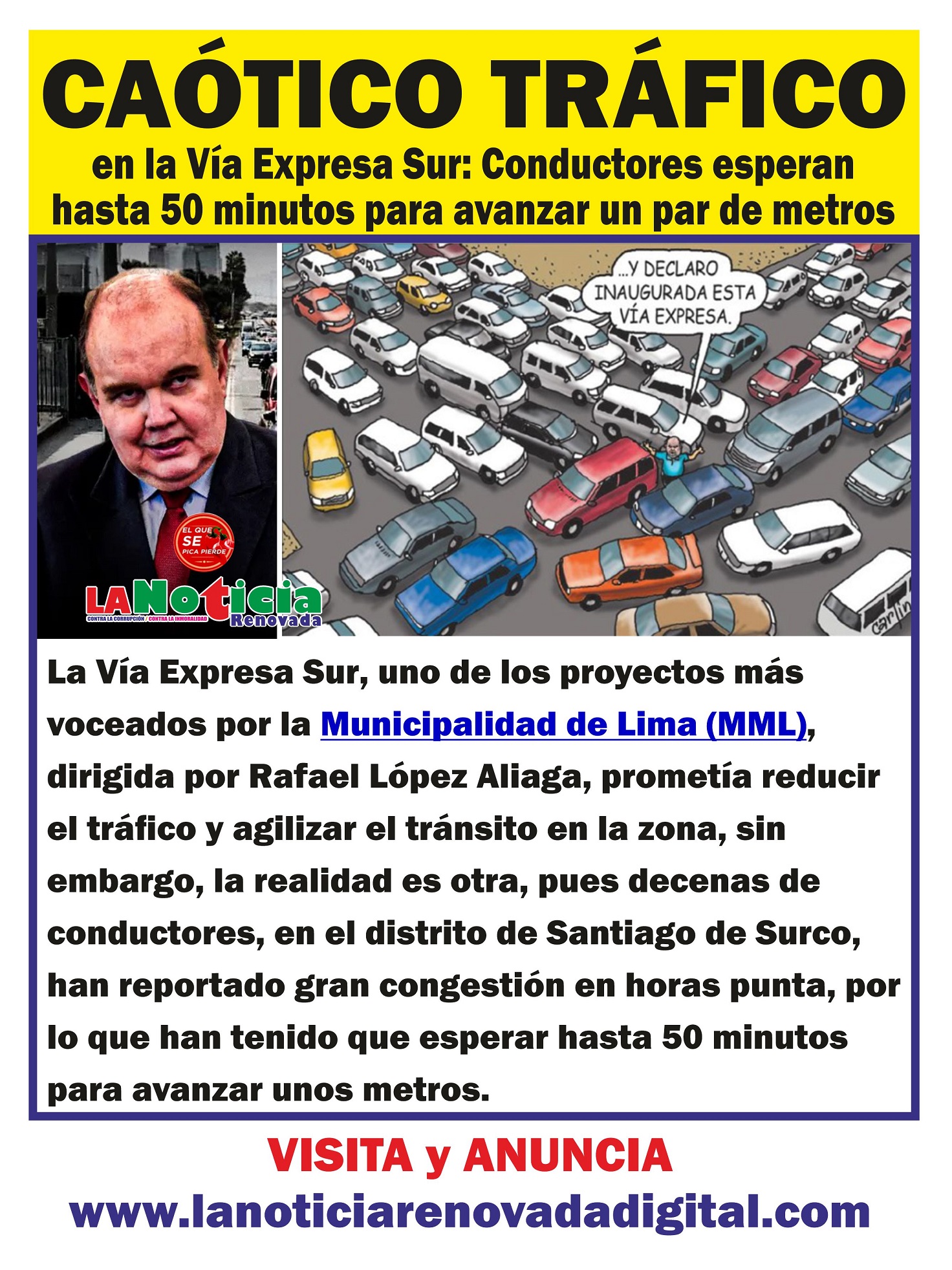 La Vía Expresa Sur, uno de los proyectos más voceados por la Municipalidad de Lima (MML), dirigida por Rafael López Aliaga, prometía reducir el tráfico y agilizar el tránsito en la zona, sin embargo, la realidad es otra, pues decenas de conductores, en el distrito de Santiago de Surco, han reportado gran congestión en horas punta, por lo que han tenido que esperar hasta 50 minutos para avanzar unos metros. La falta de señalización y semaforización han sido una de las principales críticas de este proyecto en Surco y que, según especialistas, obedece más a un acto de improvisación y populismo.